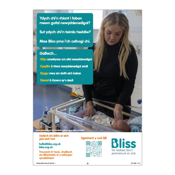 Poster i'w harddangos ar yr uned newyddendedigol fel bod rhieni a theuluoedd yn ymwybodol o Bliss a sut y gall ei gefnogi.
